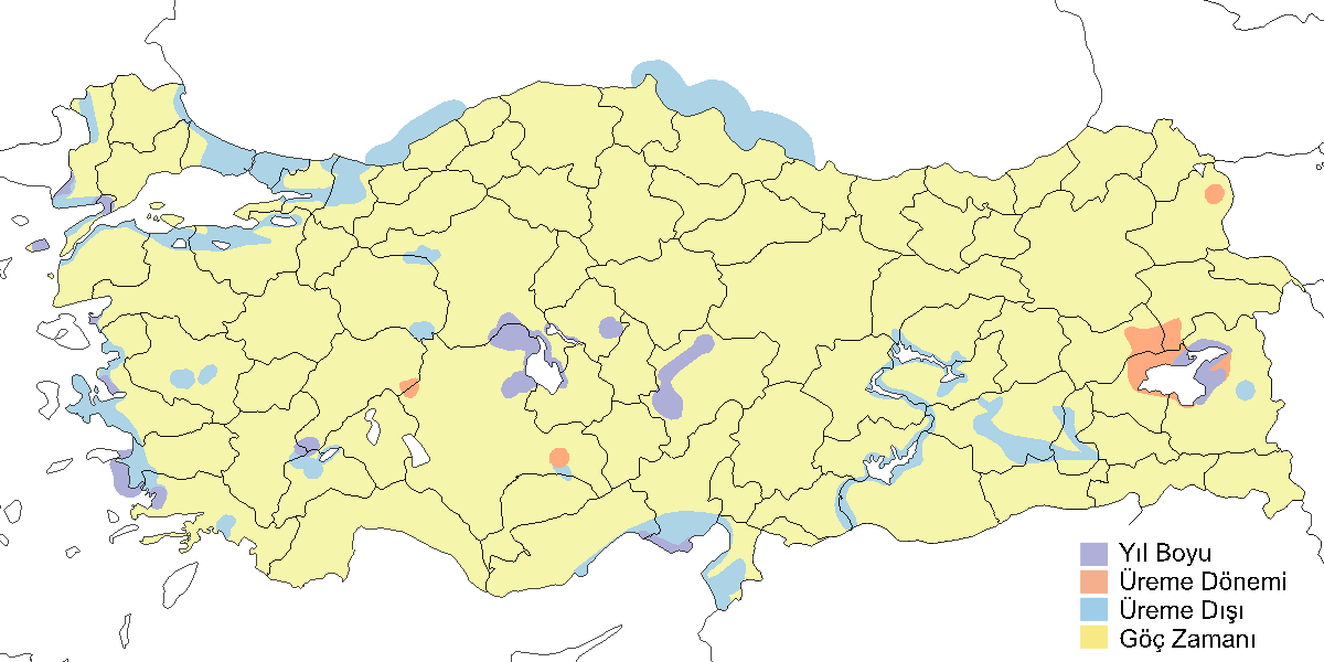 Doğu Anadolu’da 20 Kasım 2004’te Haçlı Gölü’nde uydudan izlenen bir birey sinyal verince, doğuda bir kışlama alanı olasılığı gündeme gelmiştir15. Nitekim Van Gölü ve Erçek Gölü kıyılarında sayıları 340’a ulaşan sürüler düzenli olarak tespit edilmiştir. Bugün, Türkiye’de kışlayan ana nüfusun Doğu Anadolu’da bulunduğu söylenebilir16.
