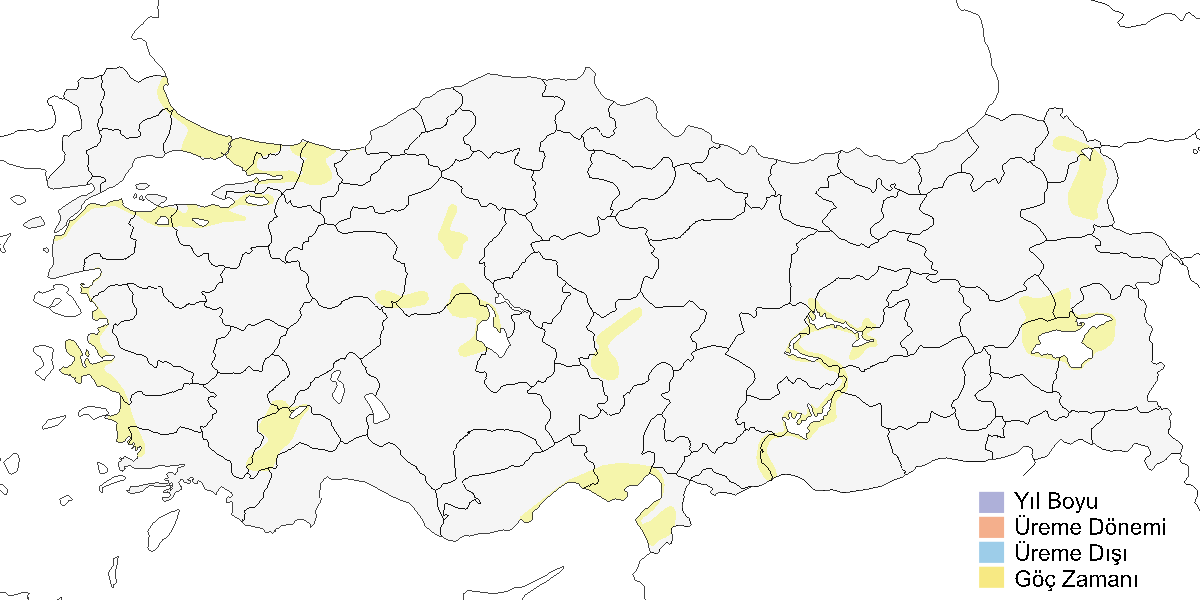 Tüm bölgelerde kaydedilen ve uygun kıyısal sulakalanlarda (çoğunlukla Ege ve Akdeniz) az sayıda (genellikle 100 birey) kışlayan düzenli bir geçit türüdür.