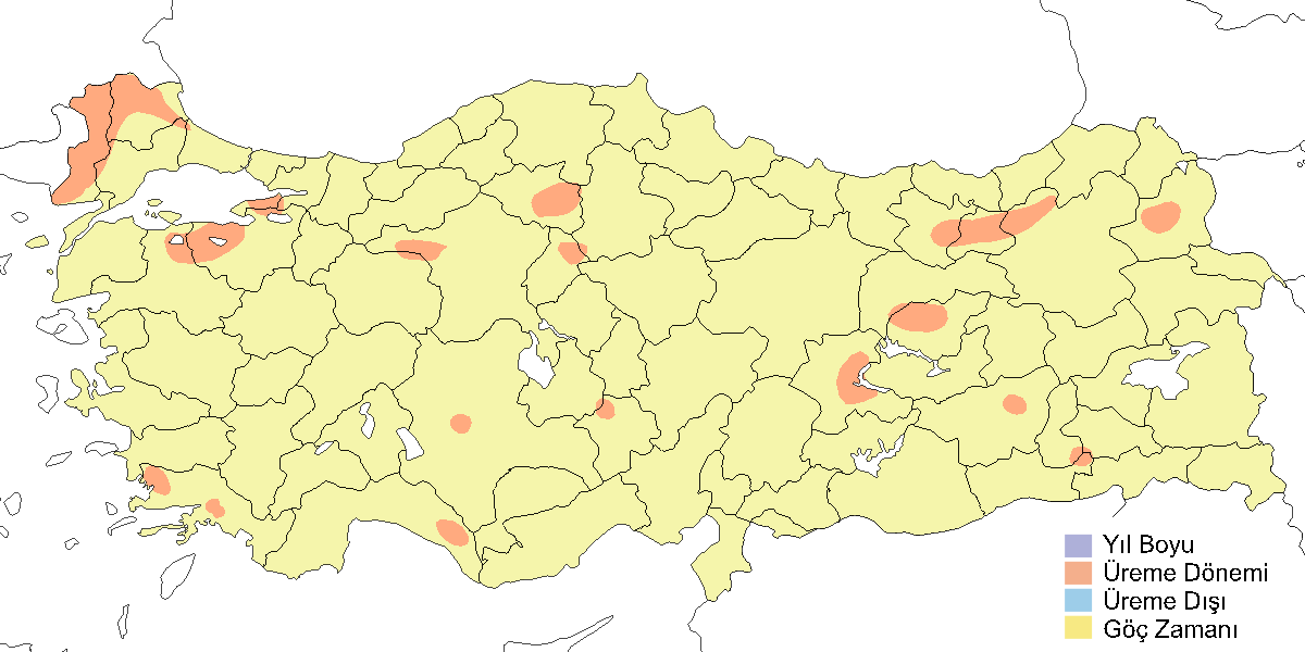İç ve Doğu Anadolu’da nispeten yaygın ve az sayıda görülen bir yaz konuğu ve geçit türüdür.