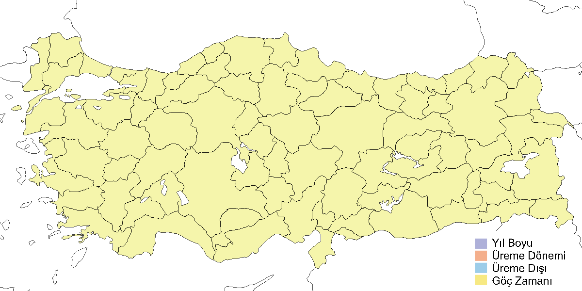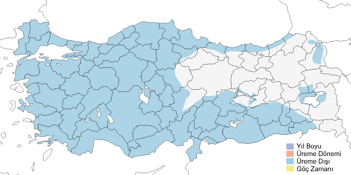 Bilinen üreme alanları dışındaki bazı kayıtlar, özellikle ağustos sonu ile şubat sonu arasında gözlendiğinden, türün üreme dönemi dışında Ege ve Akdeniz bölgelerinde sınırlı ve muhtemelen düzensiz bir yayılış gösterdiğini düşündürmektedir. İstanbul’dan bildirilen iki kayıt19 ve20 şüpheli kabul edilmektedir. Kesin olarak, 17 Aralık 2001’de Nevşehir’de, Avanos’ta Kızılırmak kıyısında bir birey kaydedilmiştir.