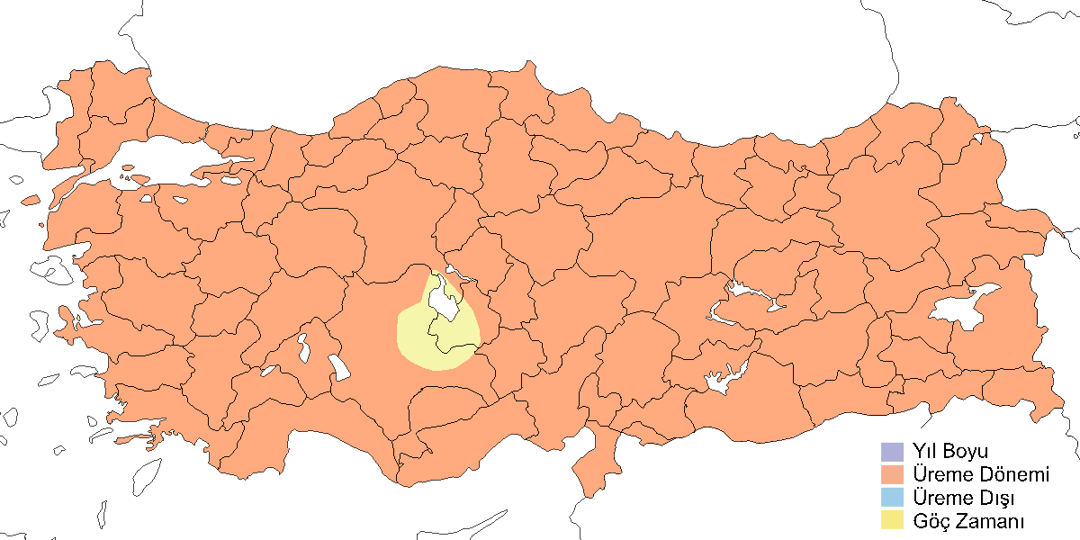 İlk üreme kaydı 1838’de Erzurum yakınlarında yapılmıştır45. İkinci üreme kaydı ise bir yüzyıl sonra, 1957’de Malazgirt’te (Muş) gerçekleştirilmiştir46. Bu tarihten sonra türün nispeten yerleşik olduğu, bazen çok büyük sayılarda bulunduğu ve genellikle üç bölgede yoğunlaştığı anlaşılmıştır: Trakya, İç Anadolu ve Doğu Anadolu. Tarım arazileri ve yerleşim yerlerinin çevresindeki kavaklıklarda küçük üreyen gruplar oluşturur. Güneydoğu Anadolu’da ise daha küçük koloniler kurar. Türkiye genelinde 60–65 koloni tespit edilmiş ve toplam üreyen popülasyon 6500 çift olarak tahmin edilmiştir47. Ancak sonraki araştırmalar bu sayının en az iki katı olduğunu ve koloni sayısının 85’i geçtiğini ortaya koymuştur48. Buna ek olarak, Doğu Anadolu’da en az dört koloniden daha bahsedilmektedir49. Birçok koloni gözlemciler tarafından ya hiç sayılmamış ya da yalnızca kısmen sayılmıştır. Üreme sezonundan sonra yayıldığı Ege, Akdeniz ve Karadeniz’de gözden kaçan koloniler olabilir. Her durumda, Doğu Anadolu’nun türün yayılışında merkezi bir rol oynadığı ve burada daha yaygın olduğu anlaşılmaktadır. Bilinen en büyük koloni, Mayıs 1993’te Ağrı’da sayılan 1200 aktif yuvadır48.